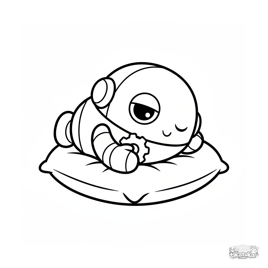 Simple toddler coloring page: a round, friendly robot rests on a cushion. Large geometric shapes, few lines, easy to color.