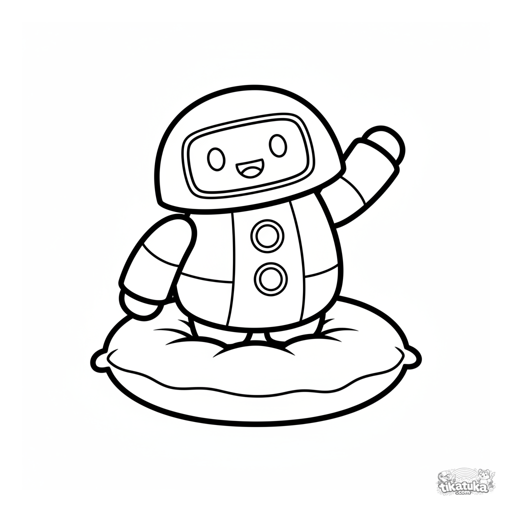 Simple coloring page for ages 2-3: a round, friendly robot waving while standing on a soft pillow. Large shapes and clear outlines.