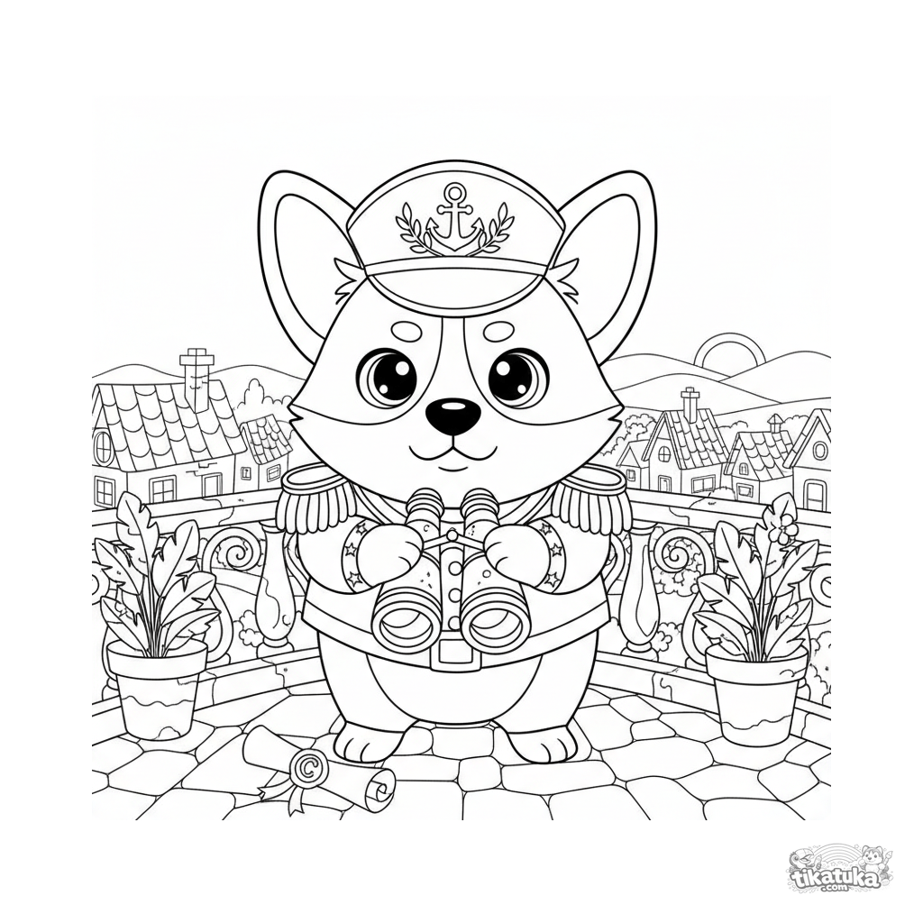 Coloring page for kids 10-12: a dignified corgi in an admiral's hat on a balcony scans with golden binoculars. Funny and detailed meme scene in a storybook style.