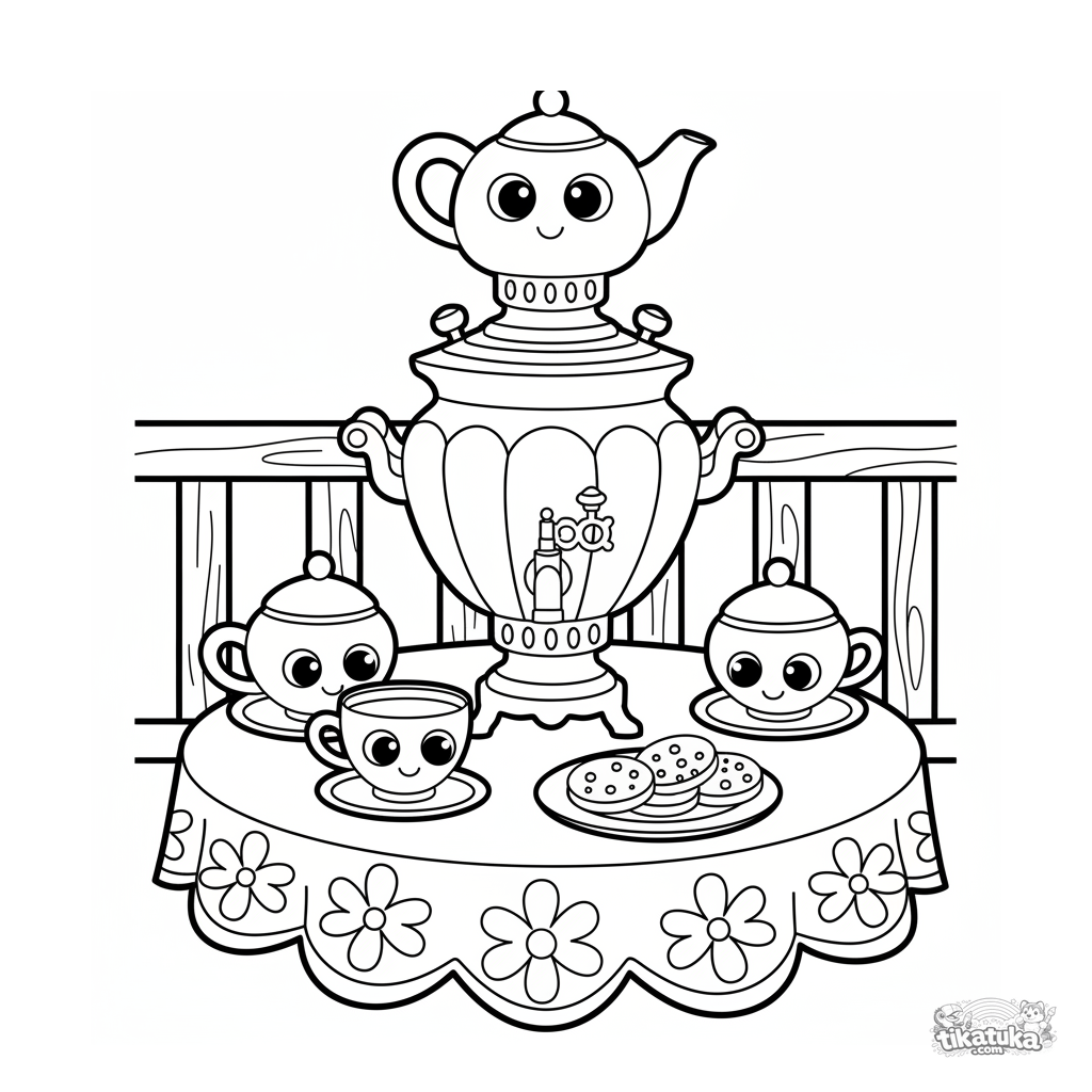 Very simple coloring page for toddlers 2-3: a samovar and tea set on a veranda table. Large clear shapes, low detail, cozy still life.