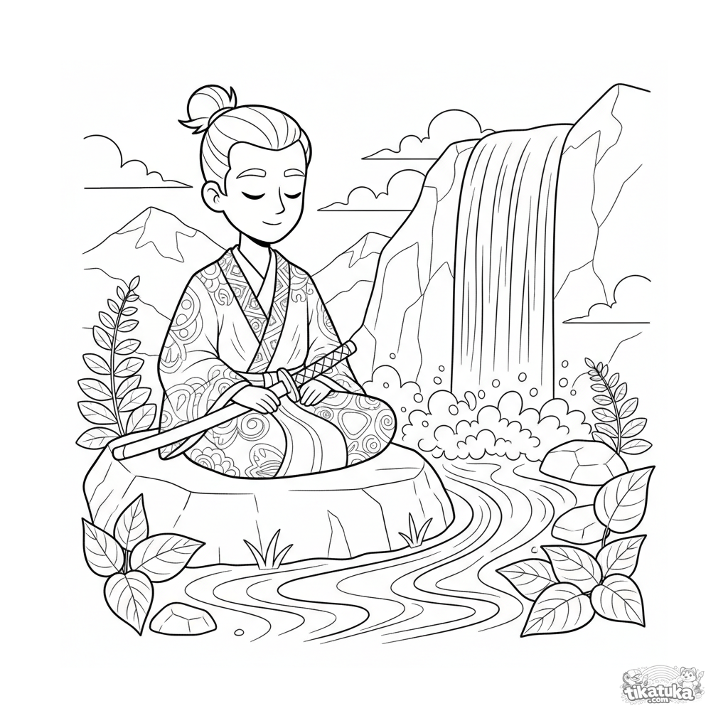 Detailed anime-style coloring page: a samurai apprentice meditates with his sword by a mountain waterfall. A scene full of water motion and tranquility for kids 10-12.