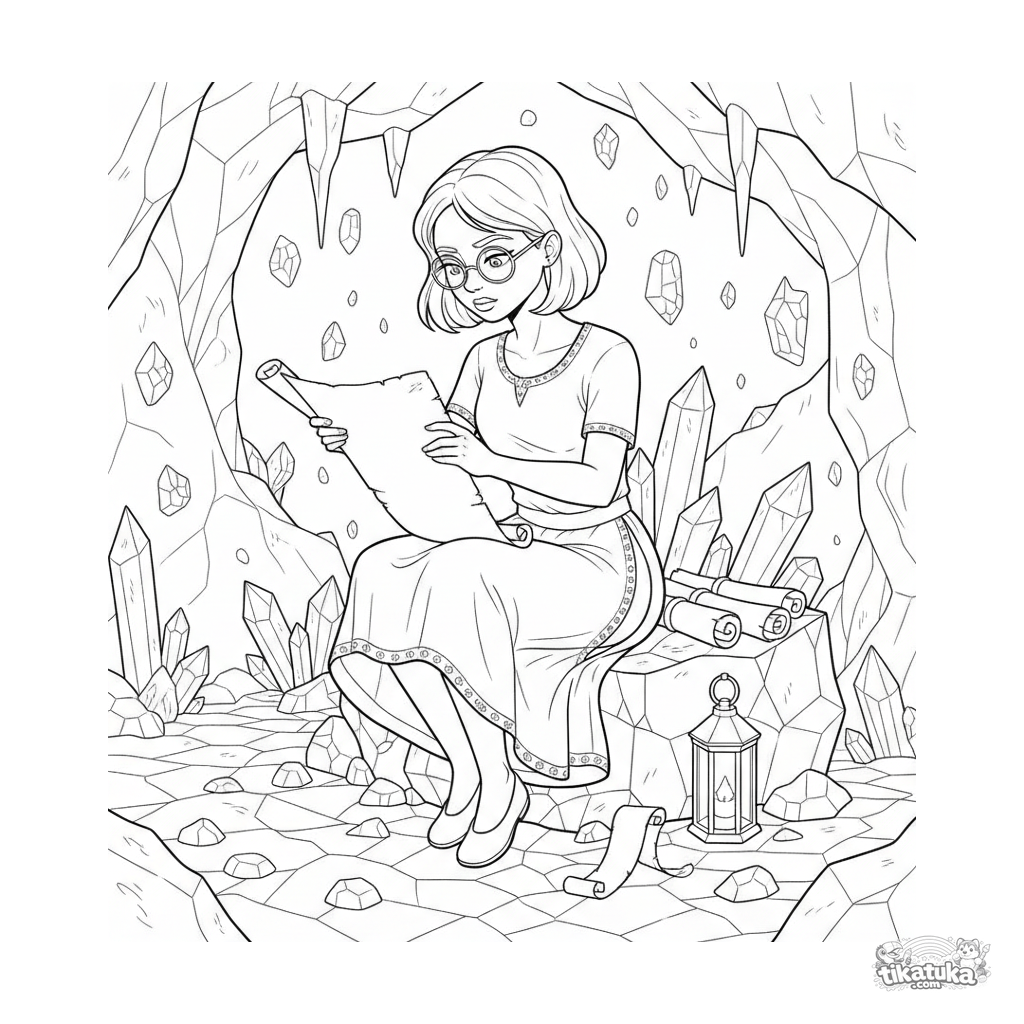 Detailed coloring page for older kids 10-12: a scholar princess reads an ancient scroll in a glowing crystal cave. Intricate details, cross-hatching style.