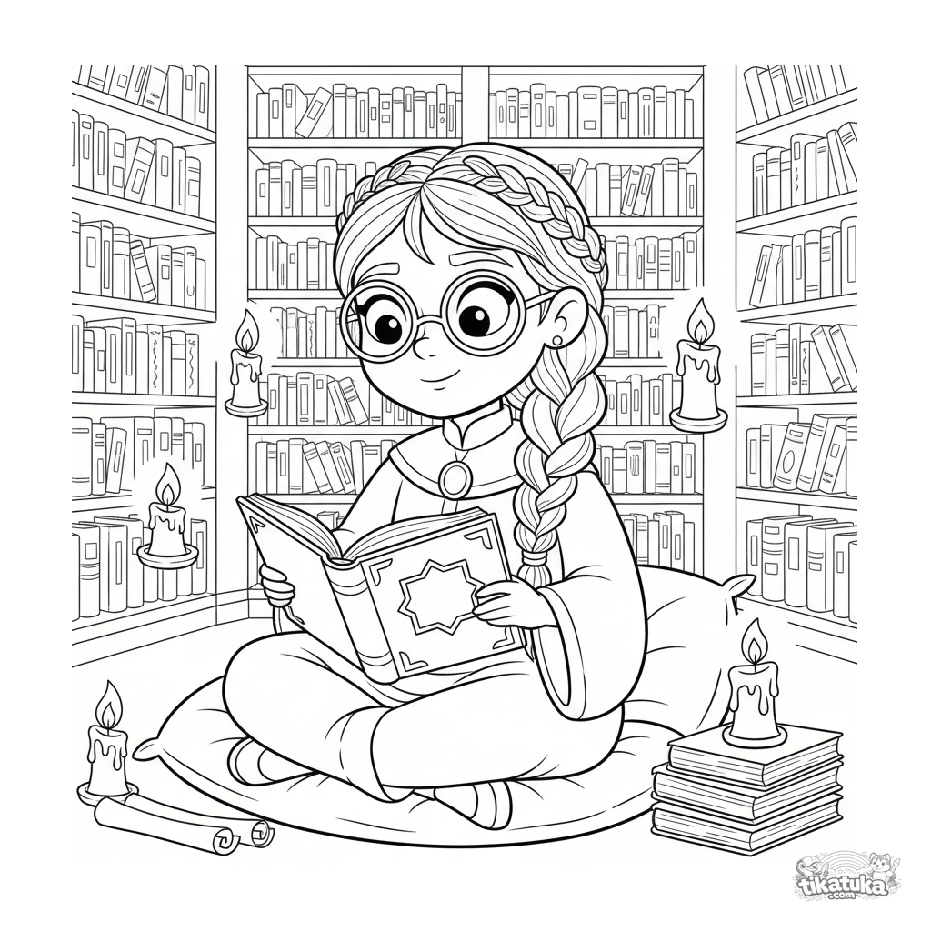 Coloring page for tweens 7-9: a scholar princess reads a magical book in an ancient library tower, surrounded by scrolls and floating candles.