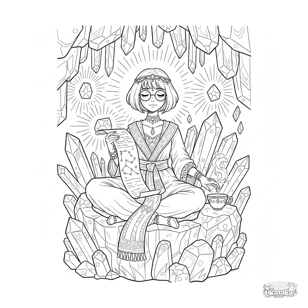 Detailed coloring page for older kids 10-12: a scholar princess studies star maps in a glowing crystal cave. Lots of textures and elements for creativity.
