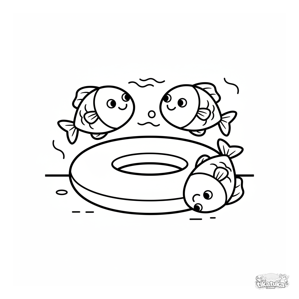 Very simple coloring page for toddlers 2-3: a school of three round, smiling fish swims happily around an inflatable ring on the pool floor. Large, clear shapes.