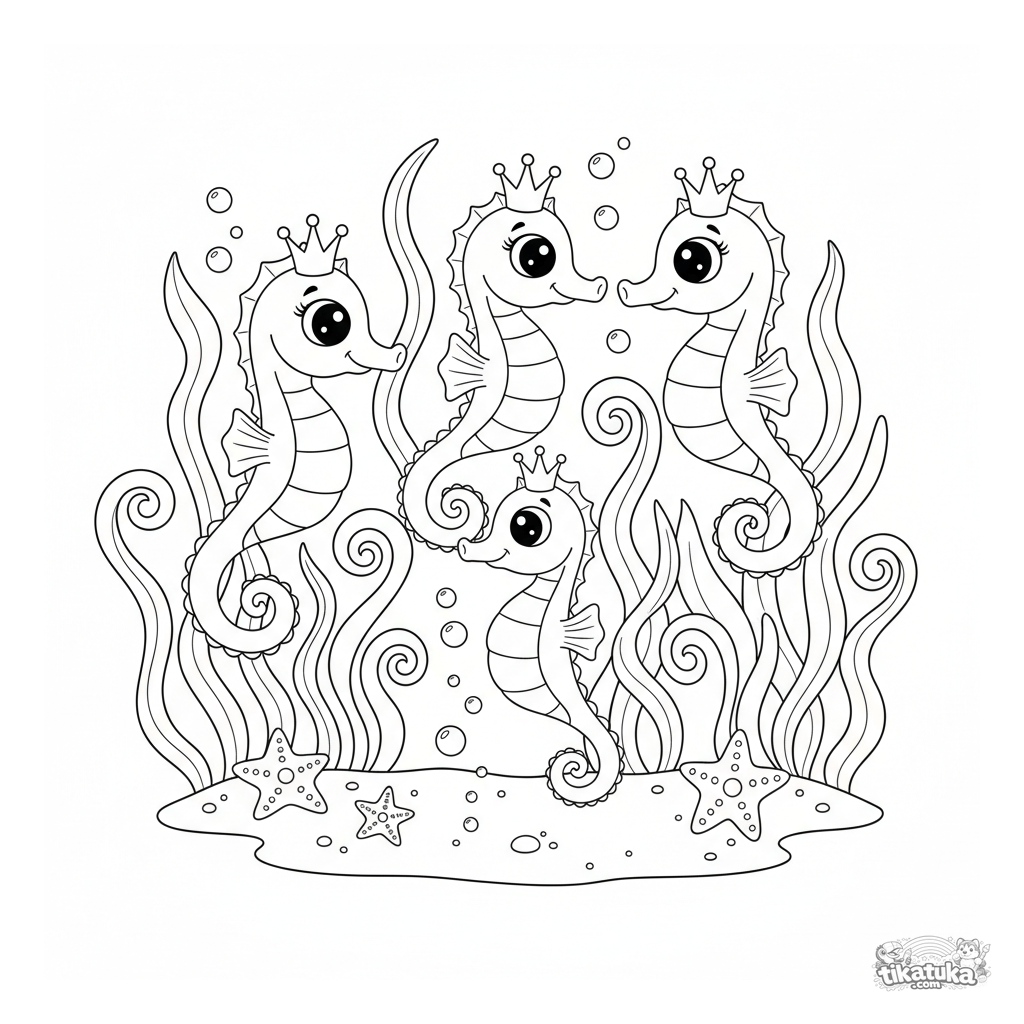 Kids coloring page: playful seahorses dance among curly seaweed in an underwater scene. Dynamic composition with bubbles, perfect for children ages 4-6 to color.
