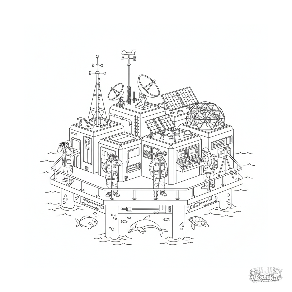 Coloring page: a detailed scientific research station on a floating sea platform for kids 10-12. Features instruments, antennas, solar panels, and scientists at work.