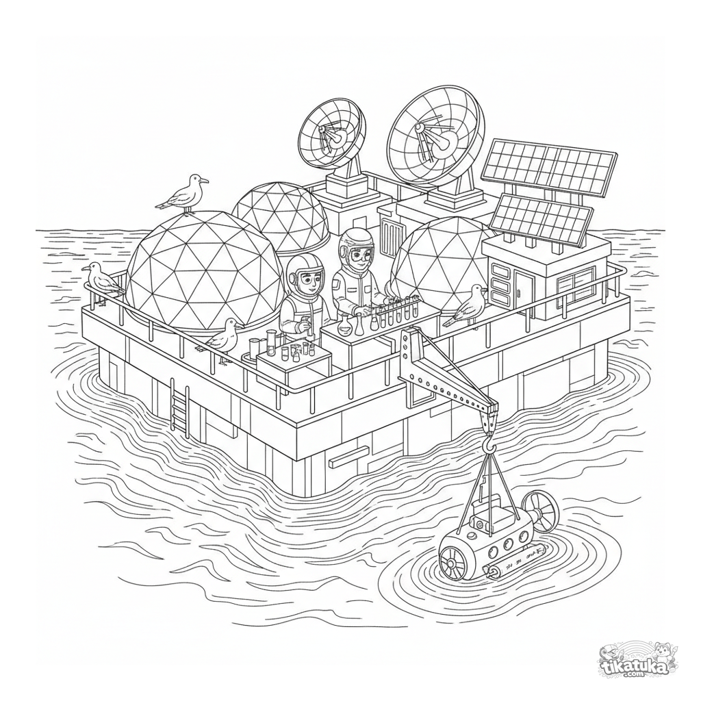 Coloring page of a marine science lab on a floating platform for ages 10-12. Detailed image with domes, drones, and scientists.