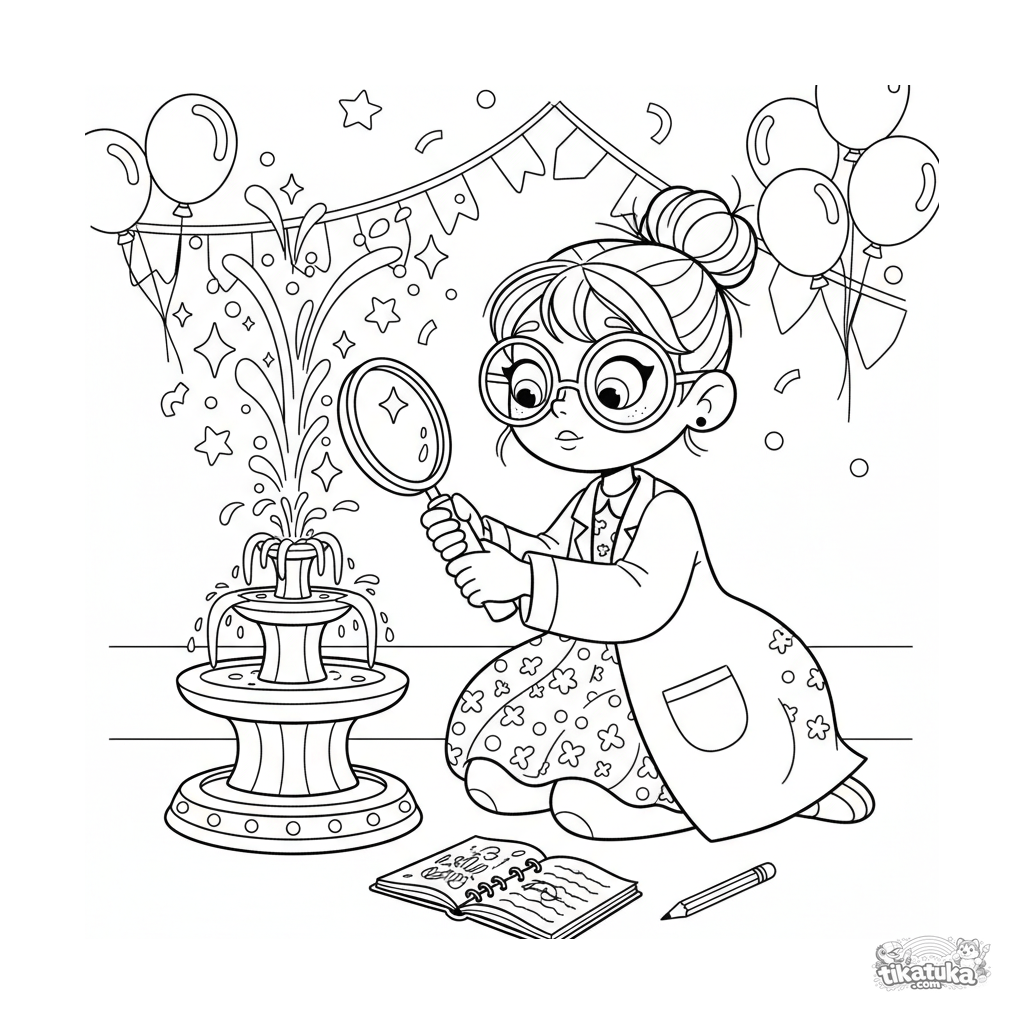 Coloring page for girls 7-9: a young scientist with glasses and a lab coat curiously examines a glittering decorative fountain in a festive hall with a magnifying glass. Scene with details.