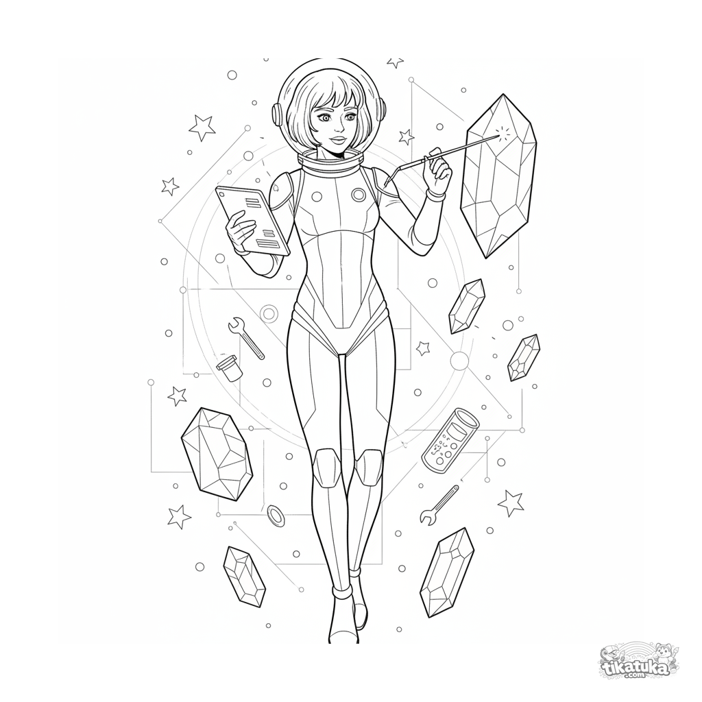 Coloring page for ages 10-12: a scientist in outer space studies floating geometric crystals, taking notes on a tablet. Detailed spacesuit, blueprint-technical style illustration.