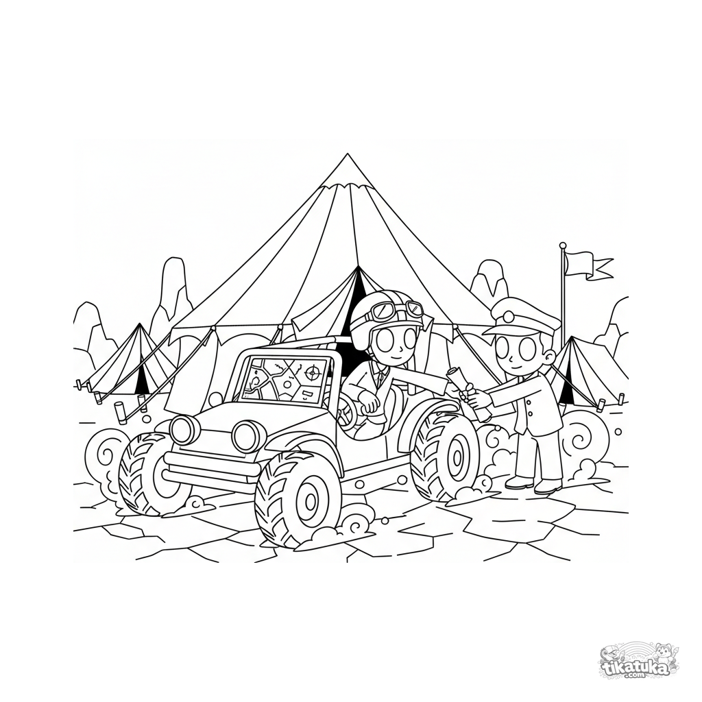 Coloring page for kids 7-9: a scout buggy urgently arriving at a field headquarters. Dynamic scene with report handoff, map, and tire skid marks.