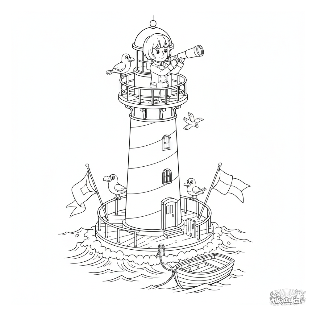 Coloring page of a sea lighthouse on a floating platform in blueprint style for ages 10-12. Details: observation deck, telescope, signal flags.