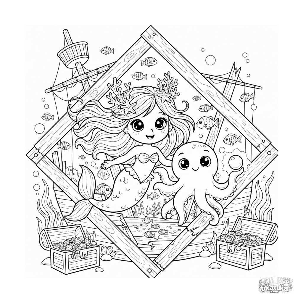 Coloring page for kids 4-6: a sea princess with a tail explores a sunken ship with a friendly octopus guide and schools of fish.