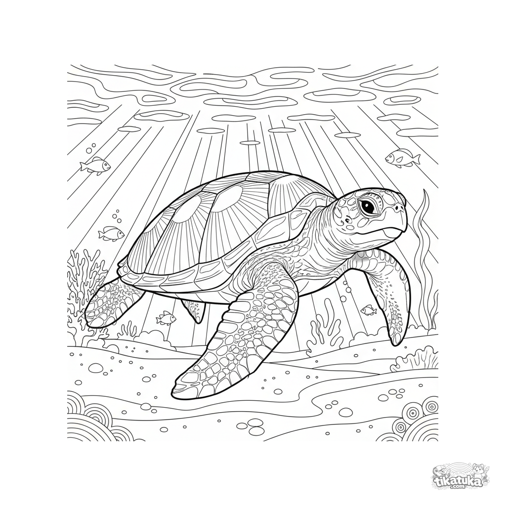 Coloring page of a sea turtle swimming in sunlit shallow water. For ages 10-12, detailed image with sand and light patterns.