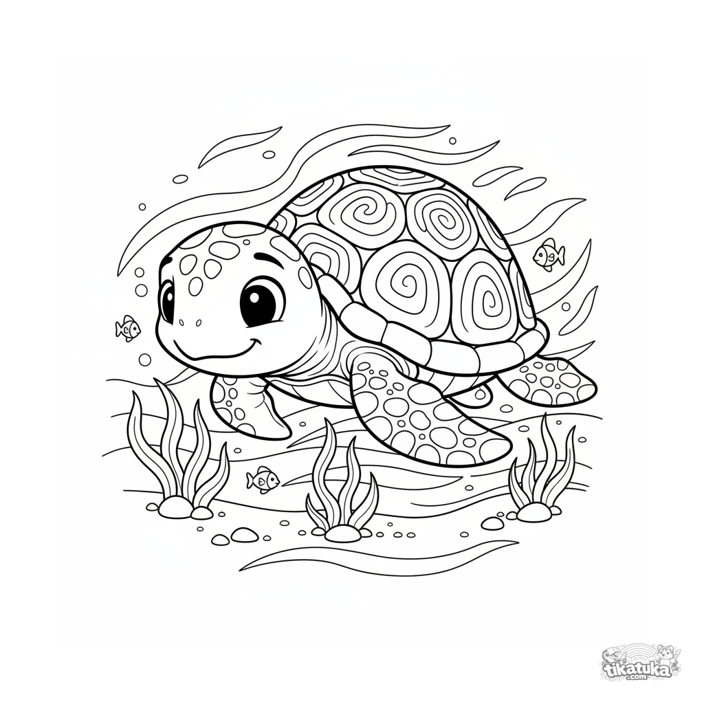 Coloring page of a sea turtle grazing on seagrass in sunny shallow water. Classic Disney-style illustration perfect for kids aged 4-6.