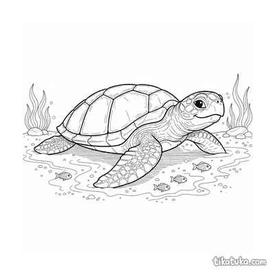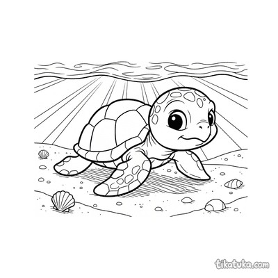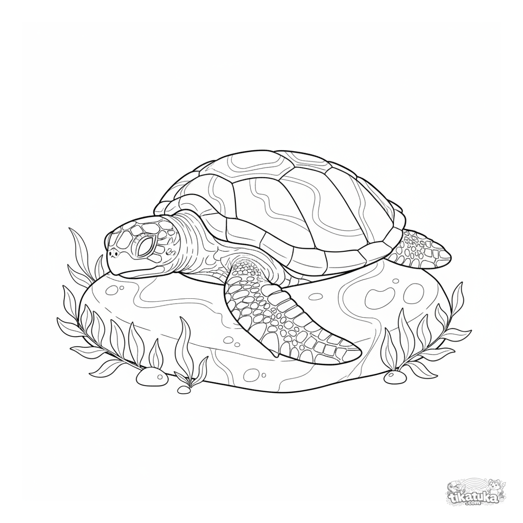 Coloring page for older kids 10-12: a detailed sea turtle naps on a flat rock bathed in sunlight in the shallows. Naturalistic shell textures, peaceful scene.