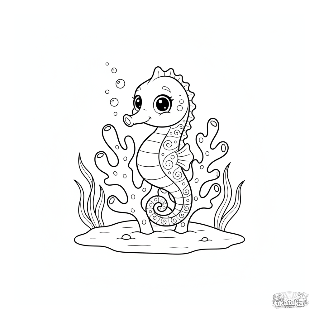 Kids coloring page: a seahorse curled around coral in a lagoon. Moderate detail of an underwater world with bubbles and seagrass.