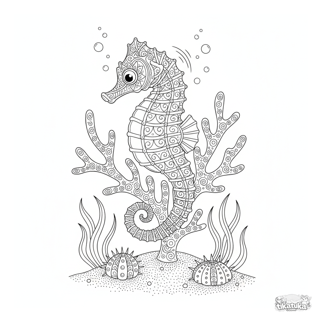 Detailed coloring page for kids 7-12 years old with a seahorse. The seahorse is curled around coral on the seabed among bubbles and seagrass.