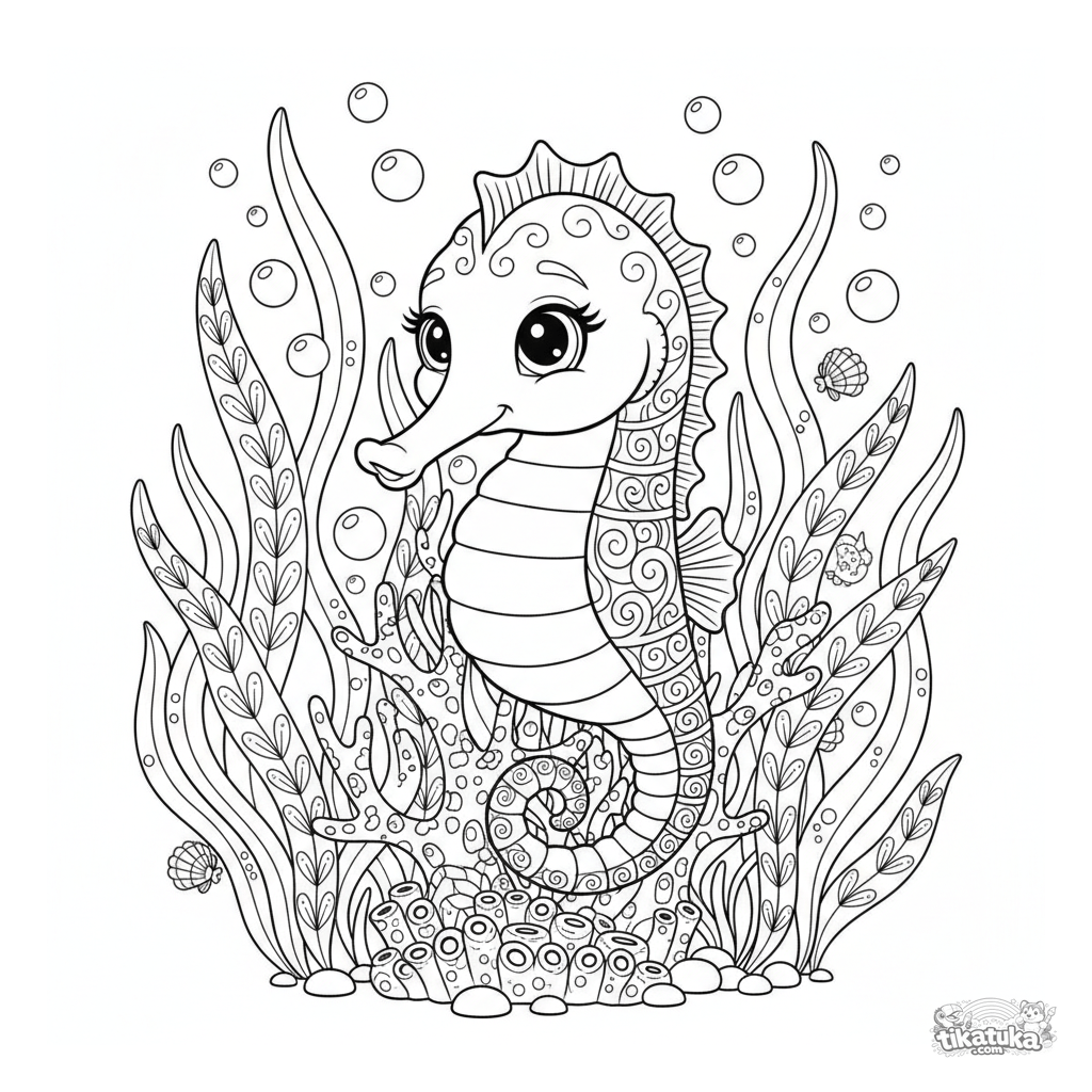Detailed seahorse coloring page for kids 7-12 years old. Features a seahorse curled around coral in an underwater kelp forest with floating bubbles.