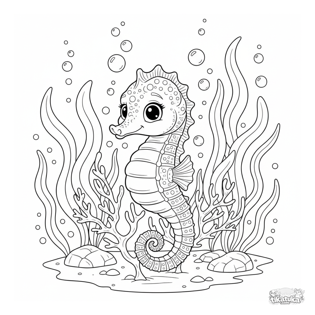Detailed coloring page of a seahorse in an underwater kelp forest for kids 7-12 years old. Scene features coral, bubbles, and flowing lines.