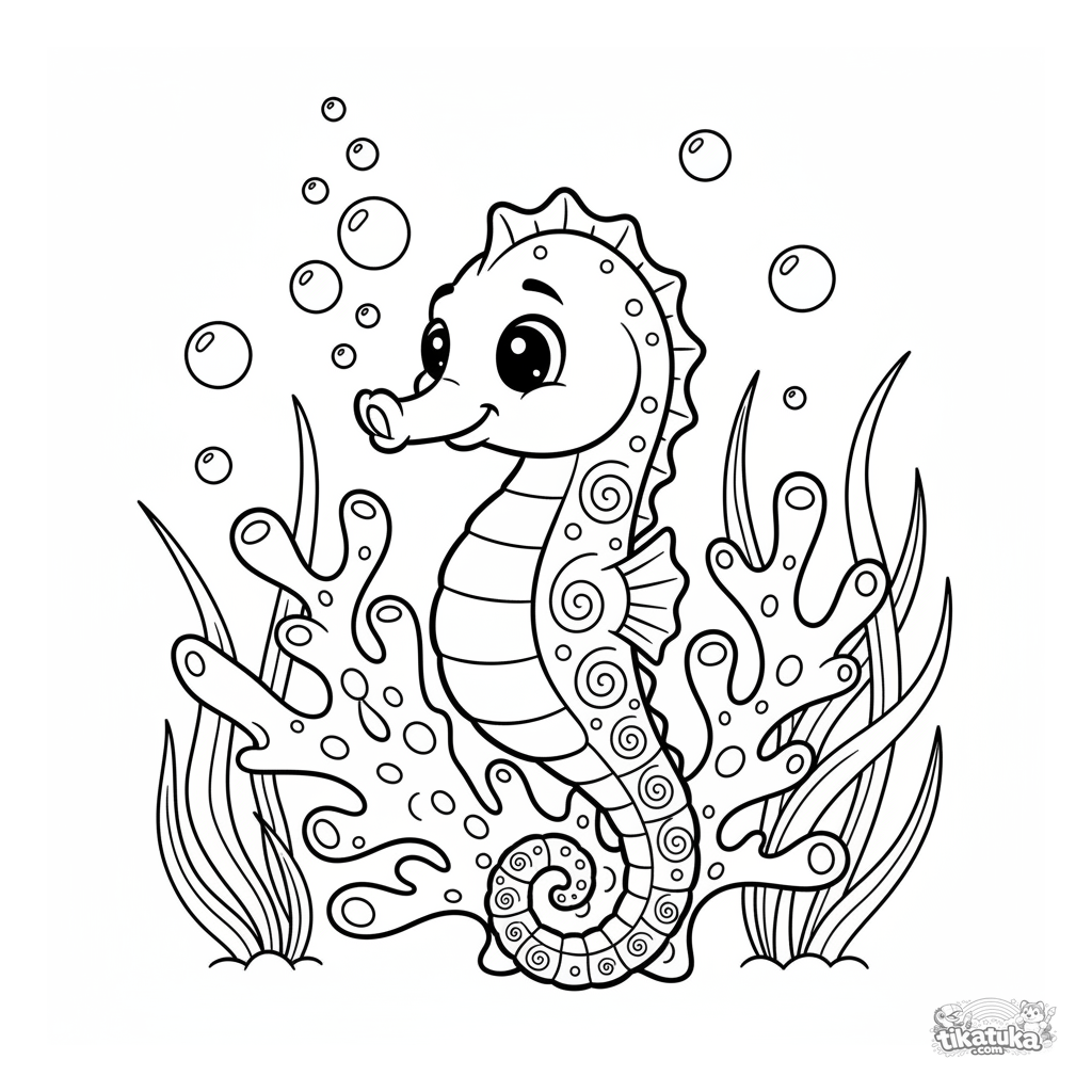 Coloring page of a friendly seahorse curled around coral. For kids 4-6. Underwater scene with bubbles and seagrass.