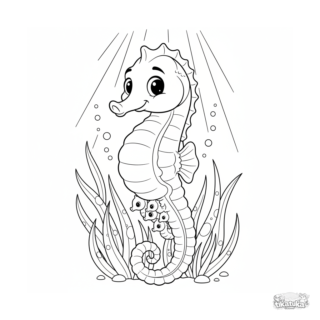 Coloring page for kids 4-6: a seahorse father carrying his babies through sunlit seagrass in shallow water. A sweet scene for developing fine motor skills.