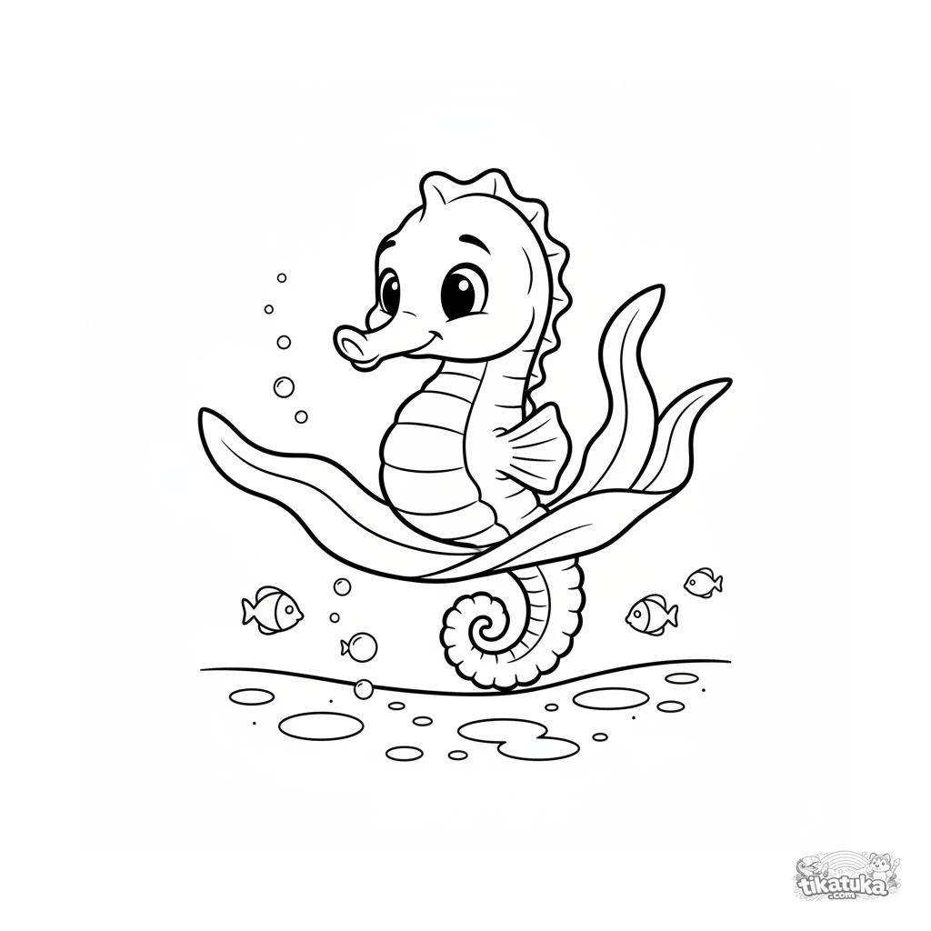 Coloring page for ages 7-9: a seahorse rides on seaweed in sunny shallow water. Illustration in classic Disney animation style with expressive details.