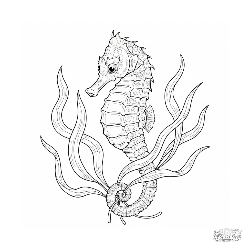 Detailed vintage-engraving style coloring page of a seahorse hitching its tail to seaweed in sunlit shallow water. For ages 10-12.