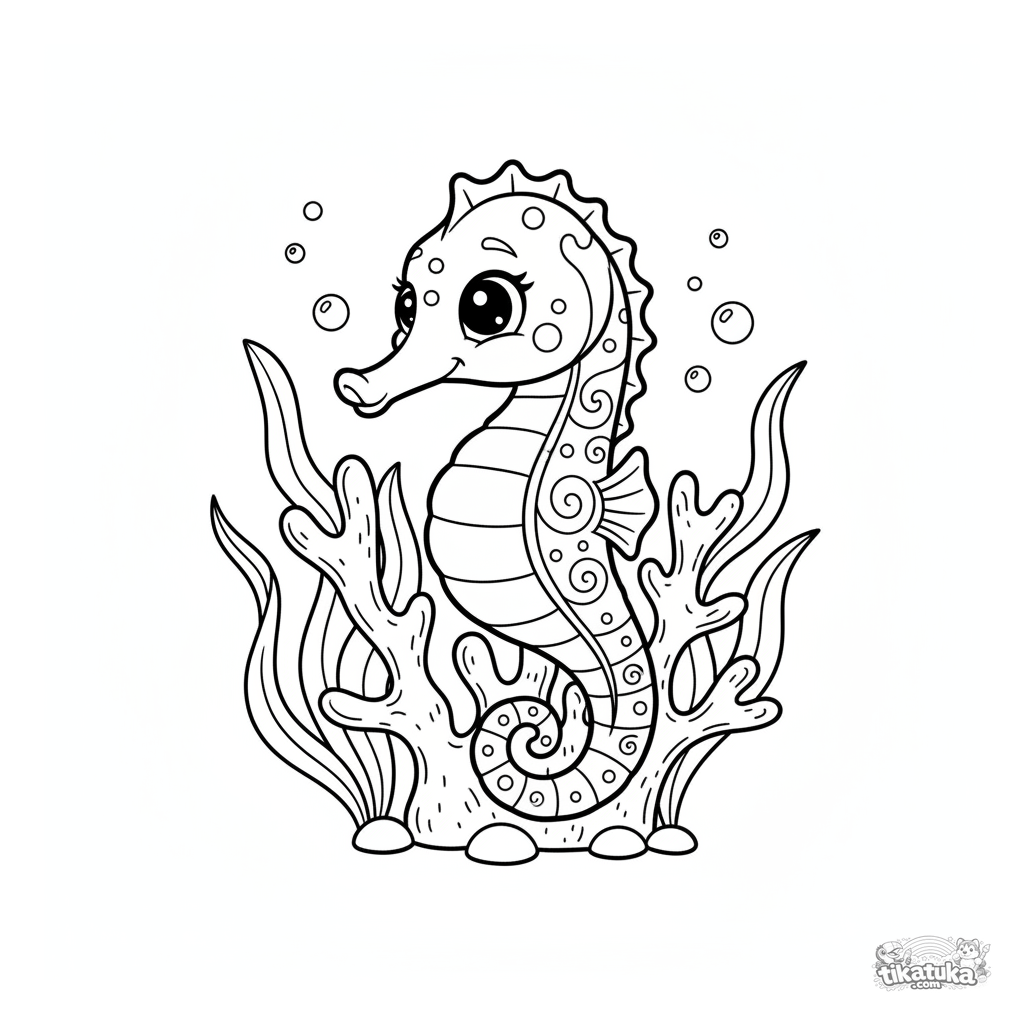 Coloring page for kids 4-6: a patterned seahorse swirls around a coral branch underwater. Medium detail, friendly scene.