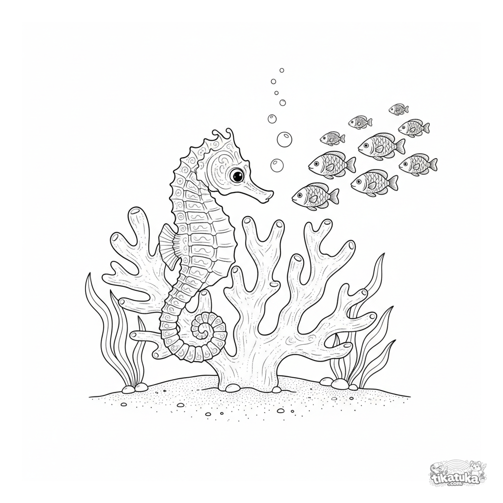 Detailed coloring page for kids 7-12 years with a seahorse. Features the underwater creature wrapped around coral among fish, seaweed, and bubbles on the ocean floor.