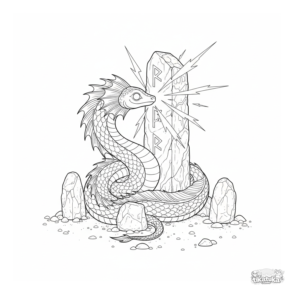 Coloring page for ages 10-12: a graceful sea serpent guardian coils around an ancient runed monolith. A detailed, realistic-style scene for avid young artists.
