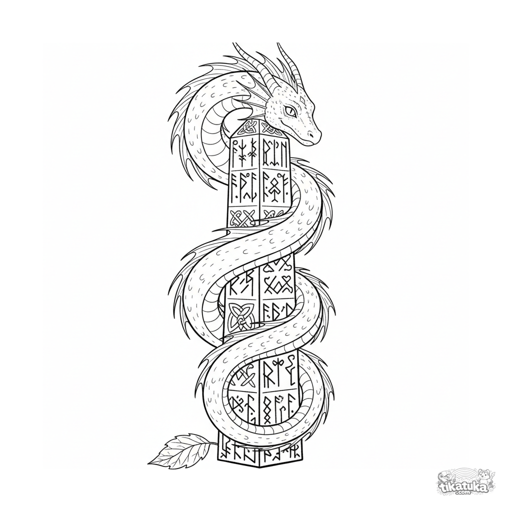 Complex coloring page for ages 10-12: a serpentine dragon coils around an ancient runed monolith. Detailed anatomy, realistic lines, legendary atmosphere.