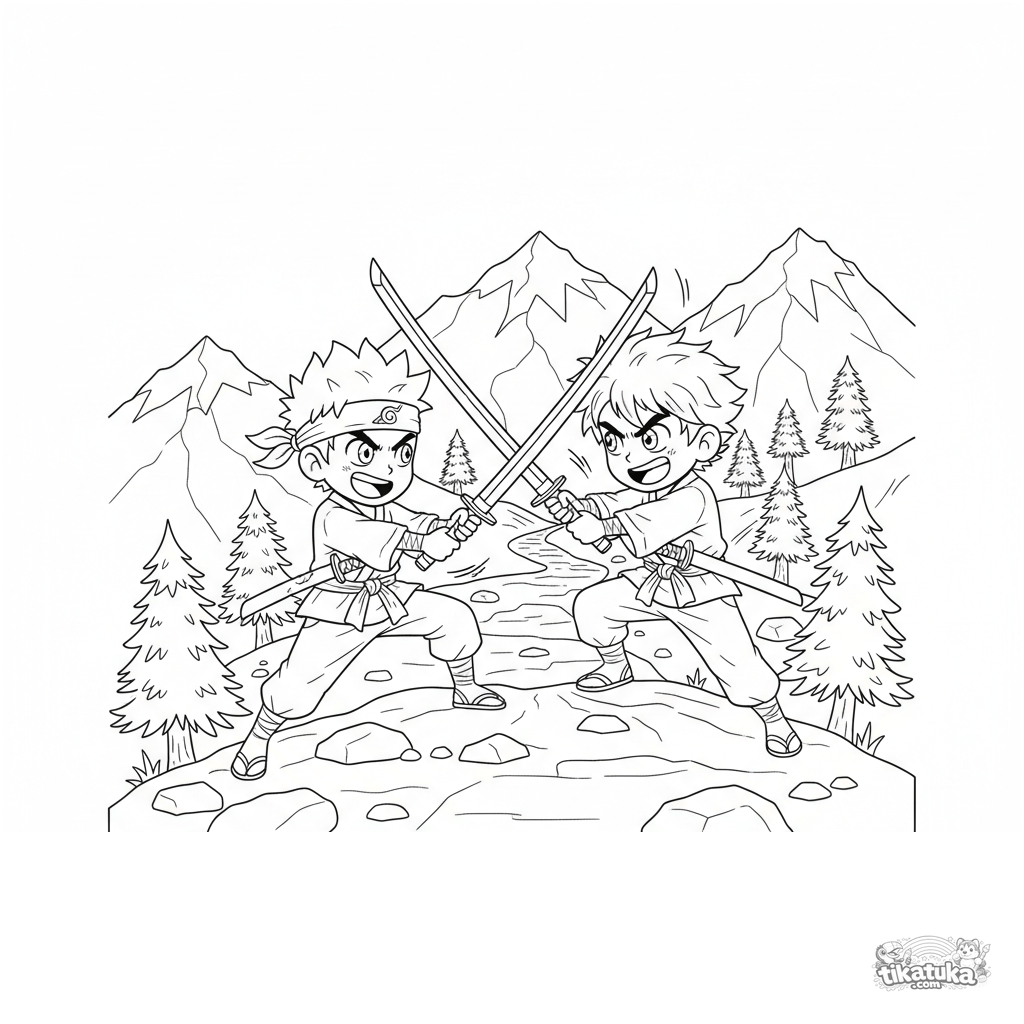 Dynamic shonen anime coloring page: two friends train with wooden swords in the mountains. A complex, action-packed scene for older kids aged 10-12.