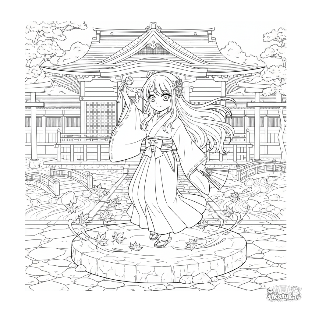 Anime-style coloring page: a shrine maiden performs a ceremonial Kagura dance in an autumn shrine courtyard. A detailed scene for ages 10-12 with intricate background and traditional elements.