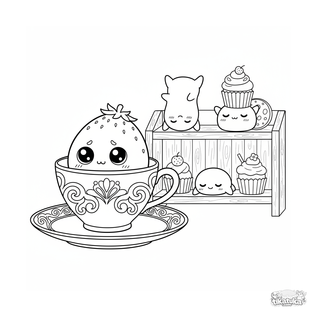 Coloring page for kids 4-6: a shy strawberry mochi peeks from behind a teacup on a sweets shelf. A cute scene with emotional expression.