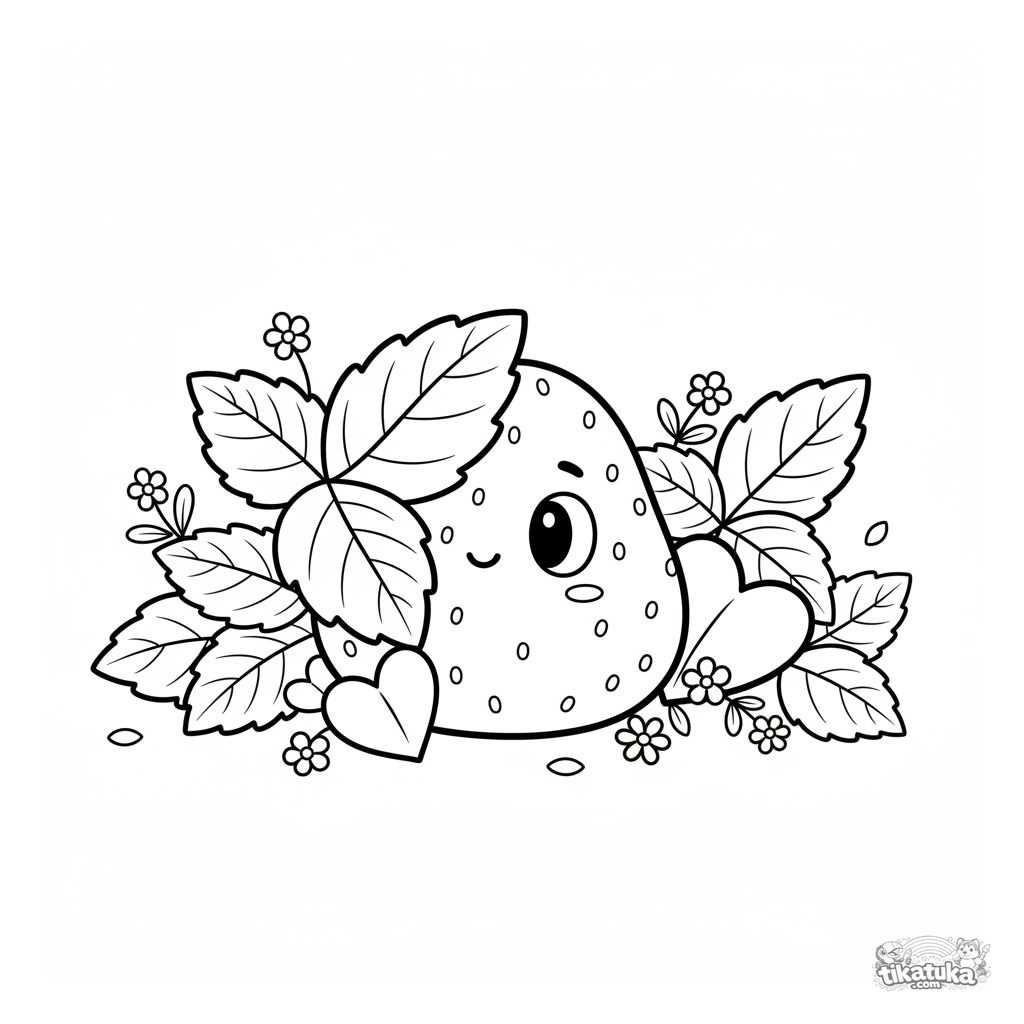Coloring page for kids 4-6: a shy mochi peeking from behind a strawberry leaf. Cute garden scene with flowers and other leaves.
