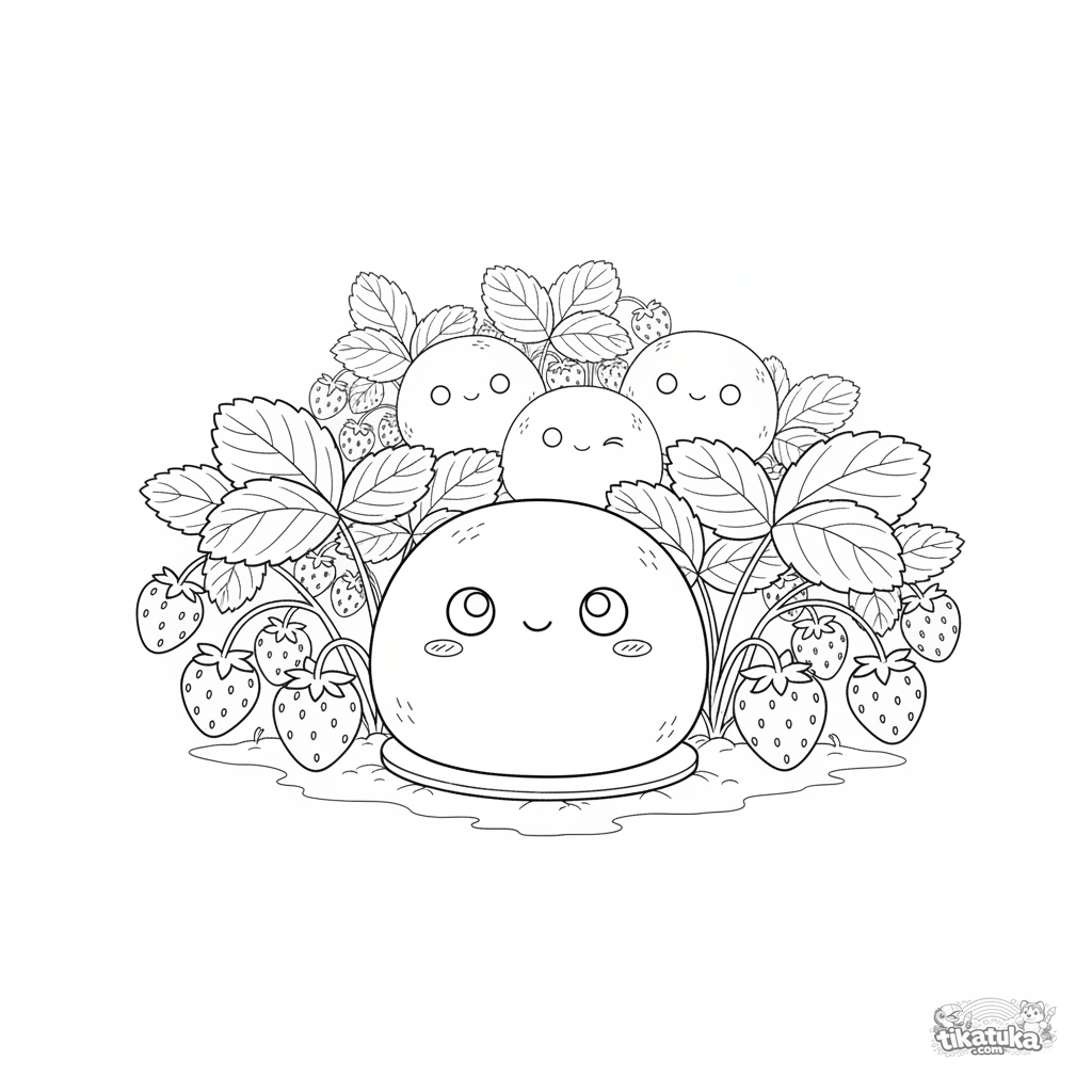 Realistic coloring page: a shy strawberry mochi peeks out from plants in a garden. A detailed scene for ages 10-12 with intricate leaves and fruits.