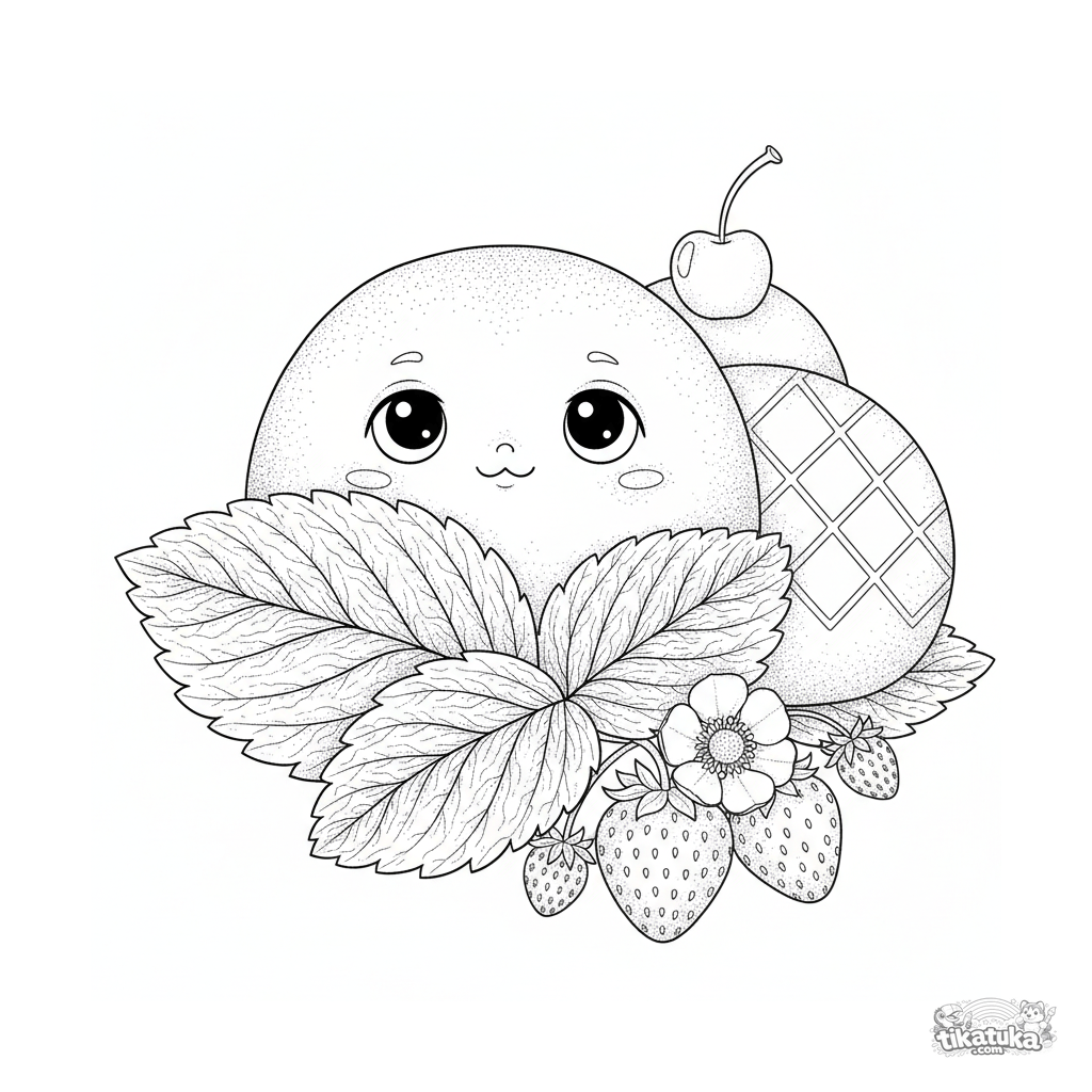 Coloring page for ages 10-12: a shy strawberry mochi peeks from behind a leaf. Detailed mochi field in a naturalistic, field-guide style.