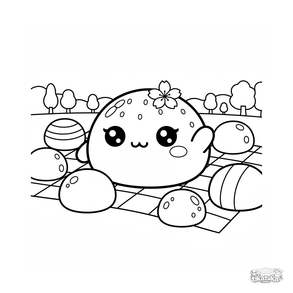 Coloring page for kids 7-9: a shy strawberry mochi sits on a checkered picnic blanket among other mochi in a cozy scene.