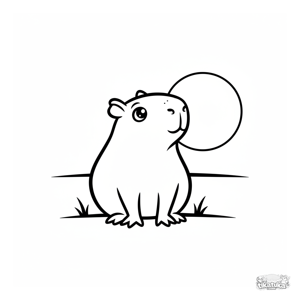 Very simple coloring page for toddlers 2-3: a large capybara silhouette against a sunset. Big shapes and wide margins perfect for first crayons.
