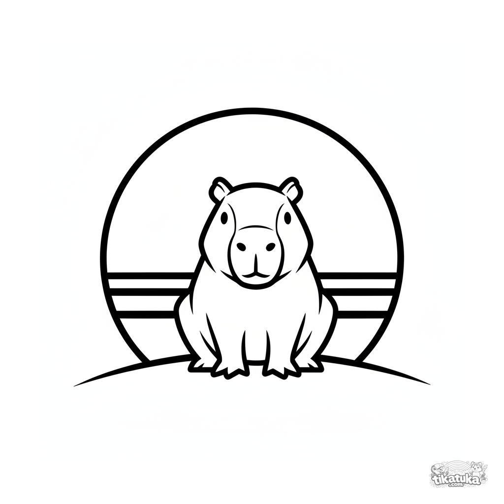 Very simple coloring page for toddlers 2-3: a large capybara sits on a hill against a sunset. Large shapes, wide margins for first coloring experience.