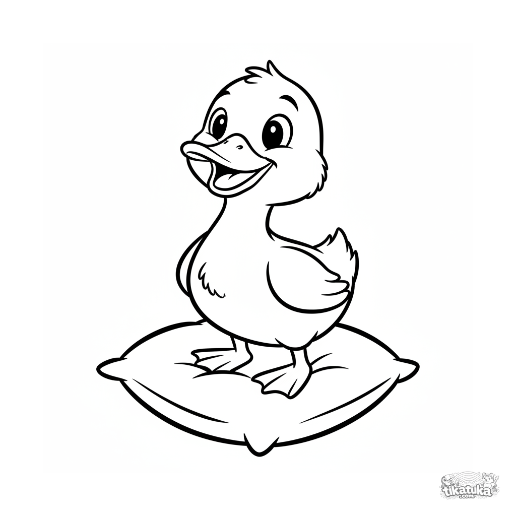Coloring page for the very young: a cute duckling sits on a cushion. Very simple and large shapes, suitable for children from age 2.
