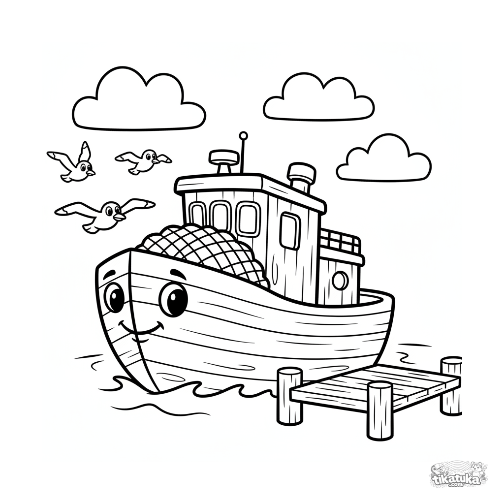 Toddler coloring page: a simple fishing trawler departs from a dock. Large, clear shapes resembling a wooden toy for first coloring lessons.