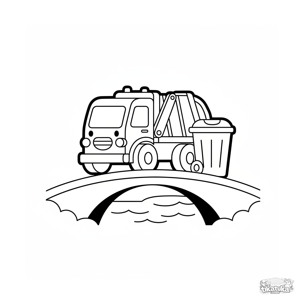 Super simple coloring page for toddlers 2-3: a happy garbage truck with its arm raised is stopped on a bridge over a river. Very thick outlines and almost no small details.