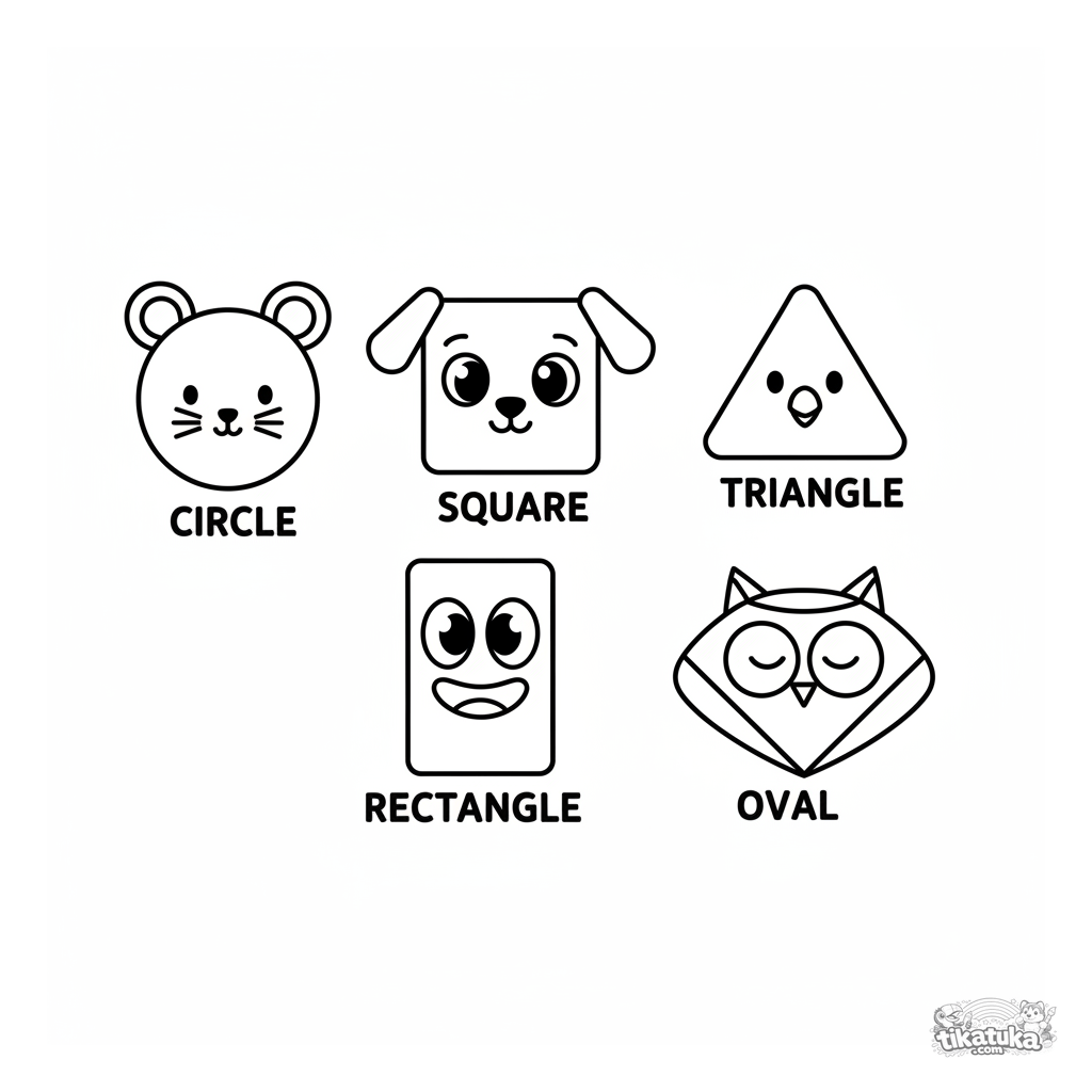 Educational coloring page for toddlers with geometric shapes as cute animals. Simple large shapes help learn shape names. For kids aged 2-3.