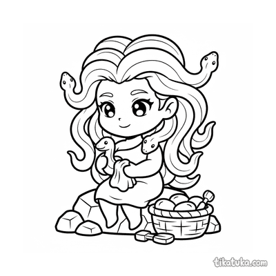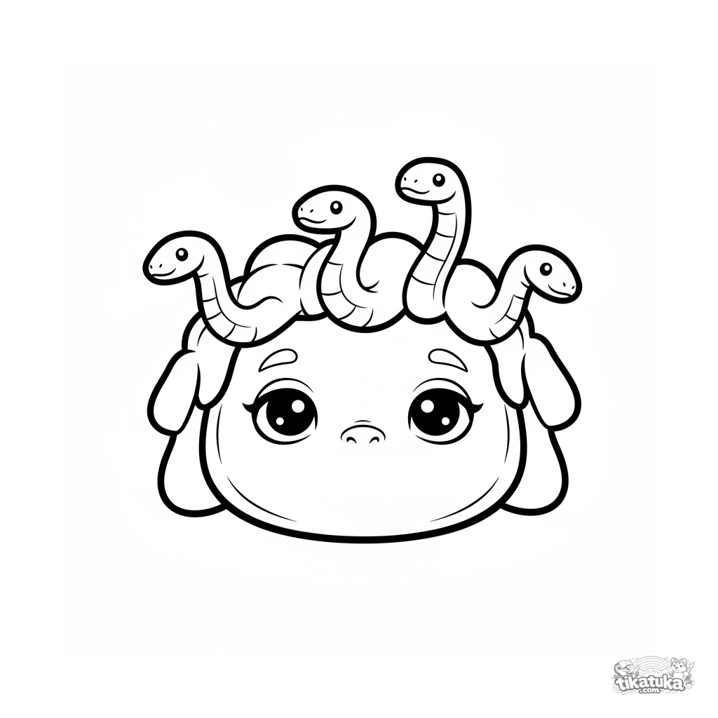 Simple coloring page: a friendly Gorgon face for the youngest. For toddlers 2-3 years old. Large clear shapes, no background, easy to color.