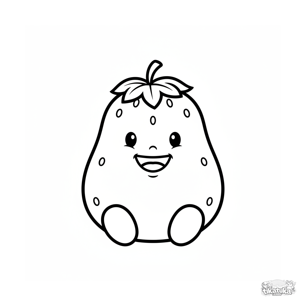 Very simple coloring page with a big smiling strawberry for kids 2-3. Large shapes, thick outlines, lots of open space for coloring.