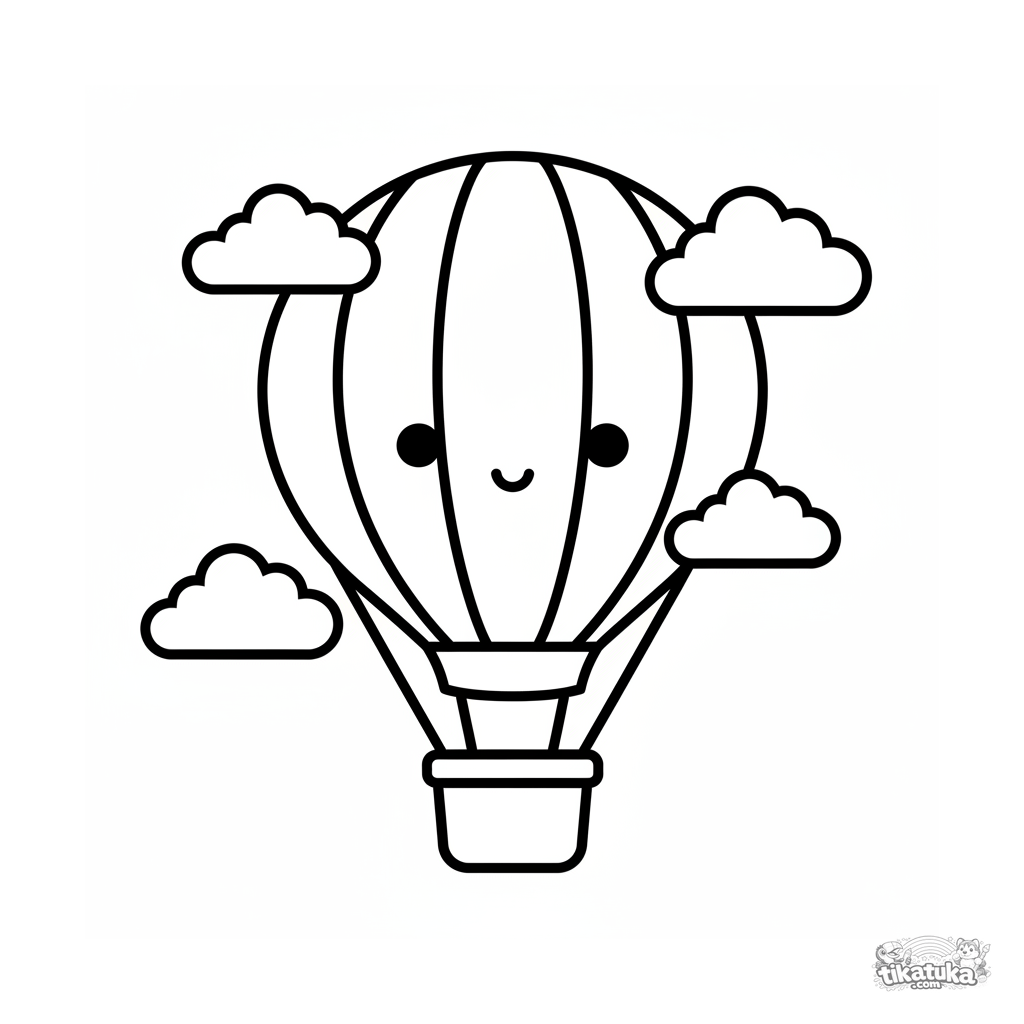 Very simple coloring page for toddlers 2-3 years: a striped hot air balloon floats in the clouds. Huge areas to color, thick outlines, minimal detail.
