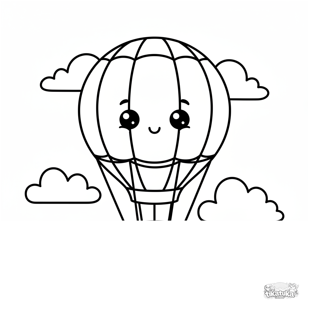 Very simple coloring page of a hot air balloon in the sky for toddlers (2-3 years old). Large clear shapes, wide margins for coloring.