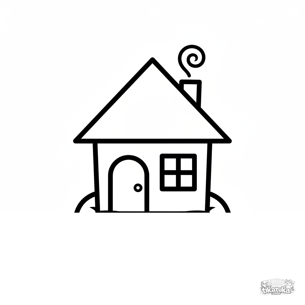 Simple coloring page for ages 2-3: a cozy house with a chimney sits on a soft cushion. Geometric shapes, clear outlines, few details.